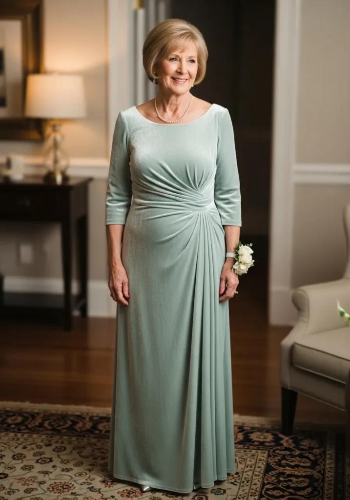This soft sage green gown features gentle draping across the bodice, three-quarter sleeves, and a flowing skirt that creates an easy, graceful silhouette with natural movement and subtle texture.