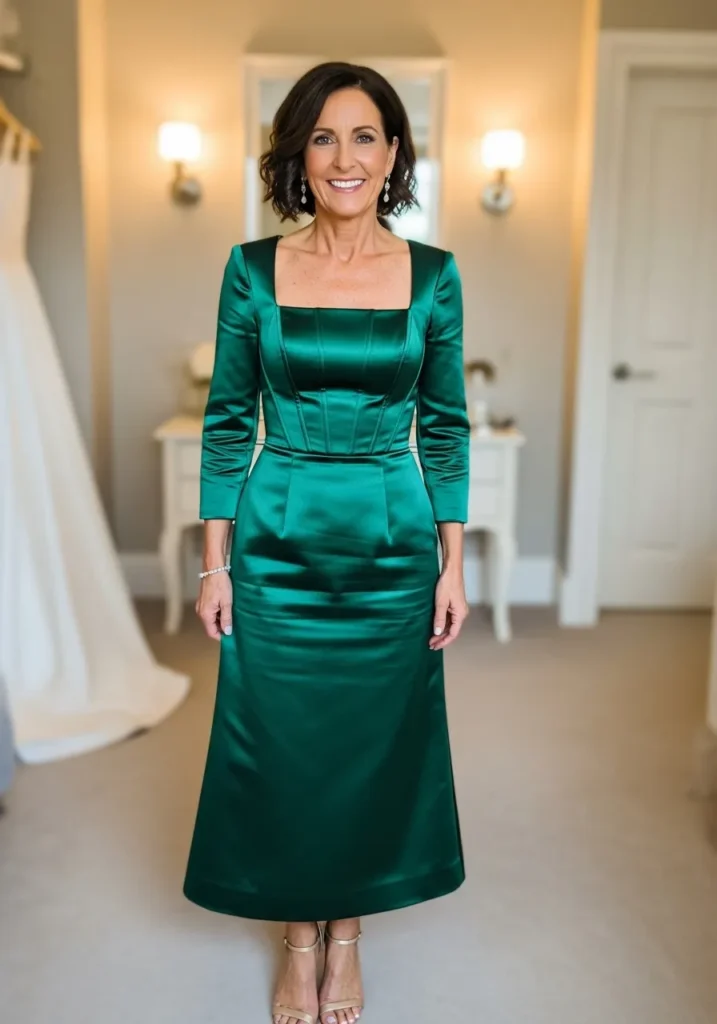 This emerald satin gown features a structured bodice, elegant square neckline, and a sleek fitted skirt that creates a beautifully polished and confident silhouette.