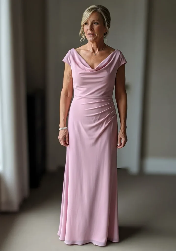 Blush Pink Satin Gown with Gentle Draped Neckline