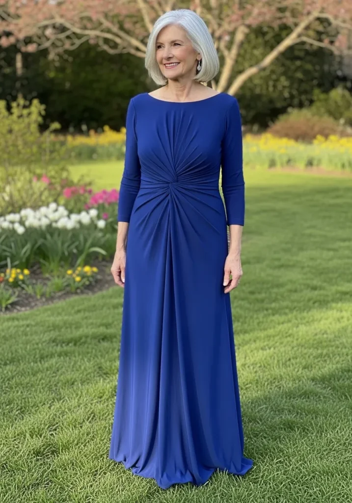 This royal blue gown features long sleeves, a softly twisted waist detail, and a flowing skirt that creates a flattering shape and elegant movement.