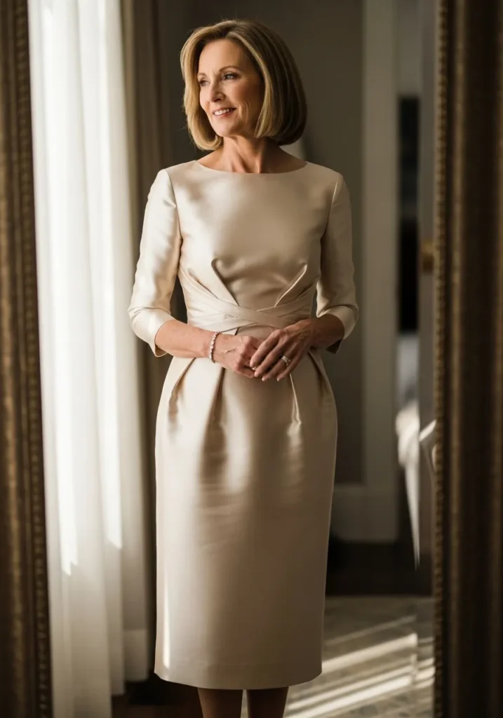 Champagne Satin Sheath Dress with Classic Tailoring