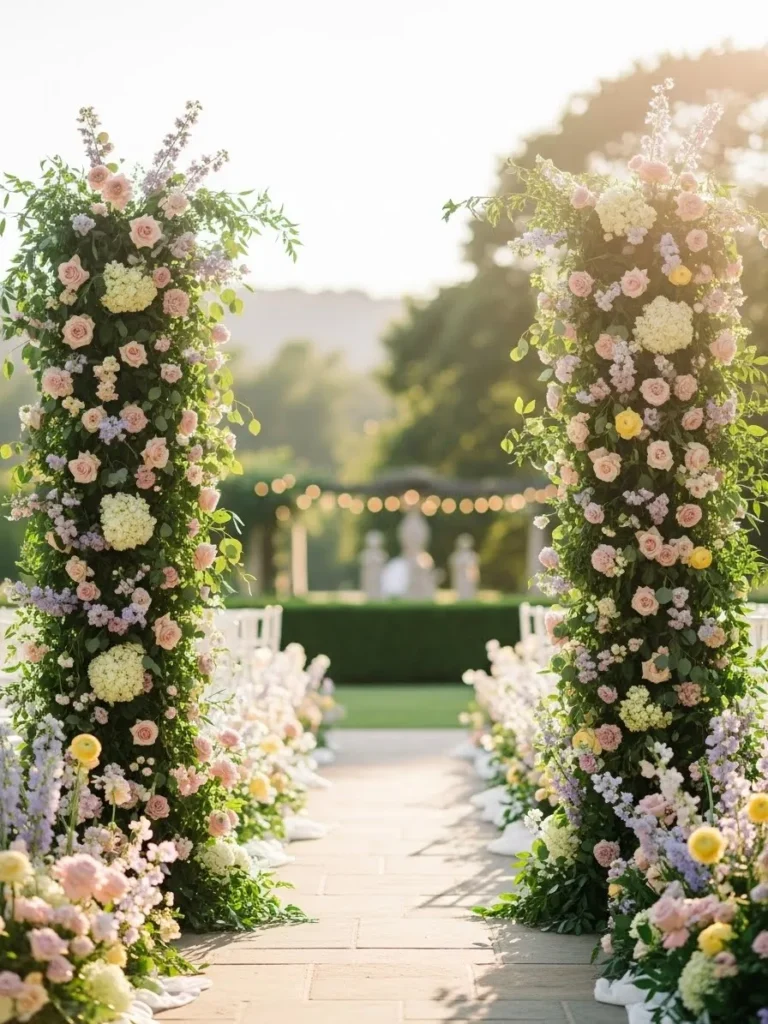 Tall floral installations frame the ceremony entrance with layers of pastel blooms and greenery. The pathway feels lush and inviting, almost like walking through a garden tunnel.