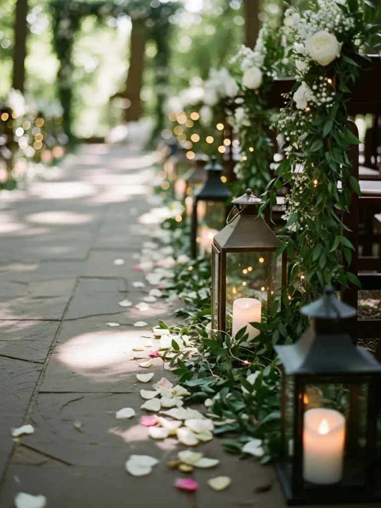 A stone pathway is lined with lanterns, greenery, and scattered flower petals leading toward the ceremony space. Soft candlelight adds a gentle glow beneath the trees and creates a romantic atmosphere.