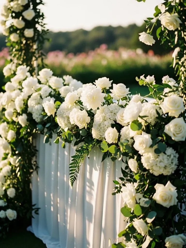 A soft white fabric backdrop is completely framed with full white roses and fresh greenery, creating a lush and romantic focal point. The florals feel abundant and layered, with the greenery adding depth and a natural garden finish.
