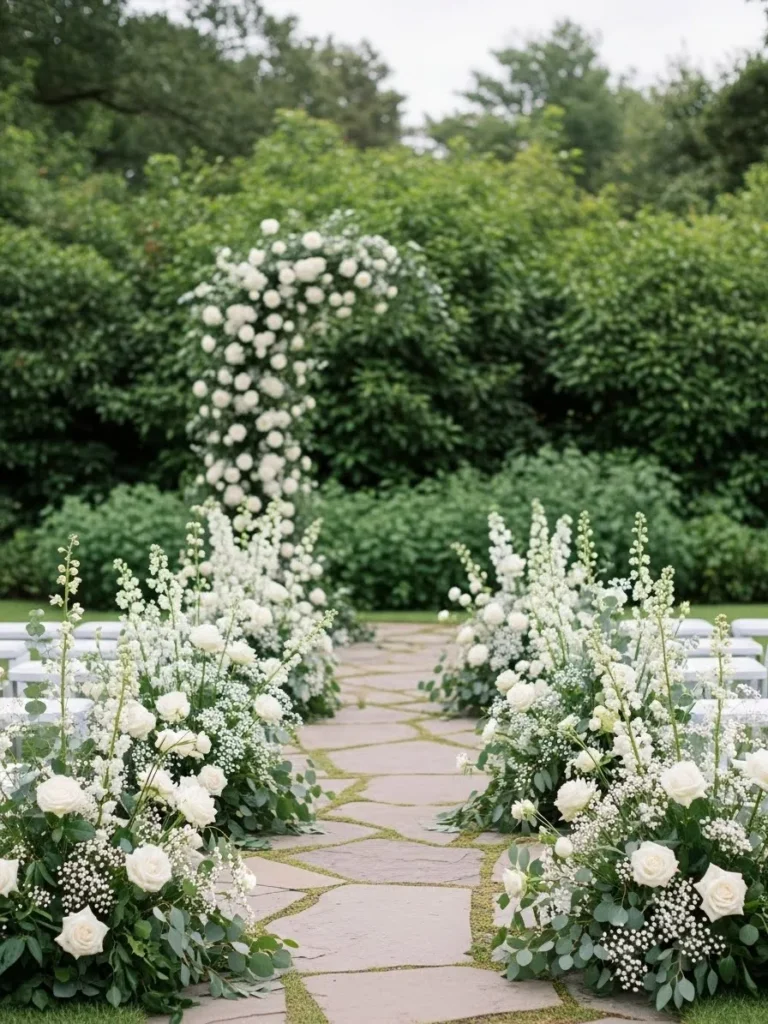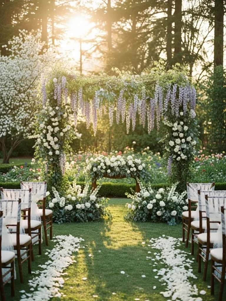 A lush garden arch is filled with white florals and cascading greenery that drape softly above the aisle. Flower petals scatter along the grass while simple wooden chairs frame the walkway and keep the focus on the ceremony space.