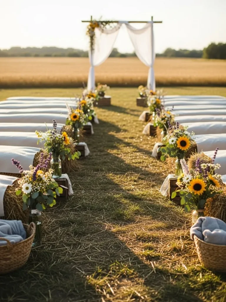 A rustic aisle runs through a field setting, lined with sunflowers and wild blooms placed in natural arrangements. The colors feel warm and cheerful, perfectly suited for an outdoor summer celebration.