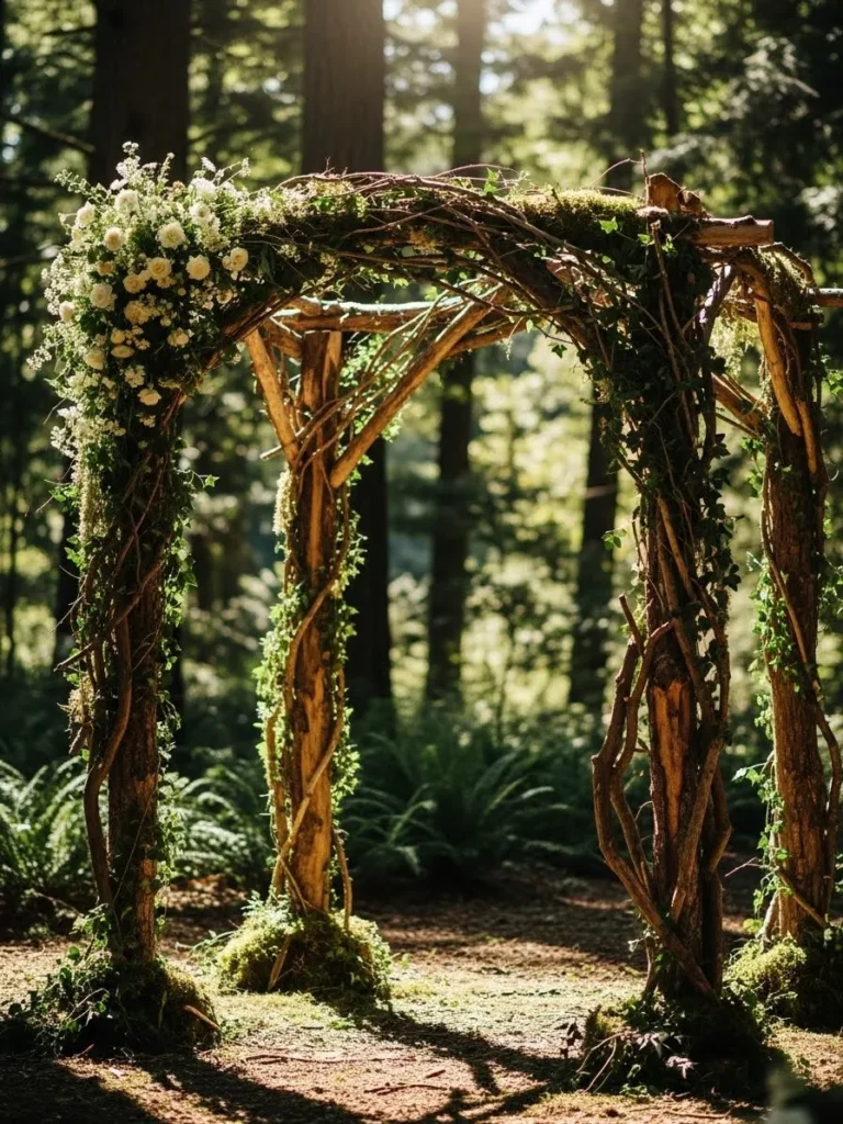 A natural arch made from twisted branches is decorated with soft florals and greenery, blending beautifully into the forest surroundings. The structure feels organic and perfectly imperfect.