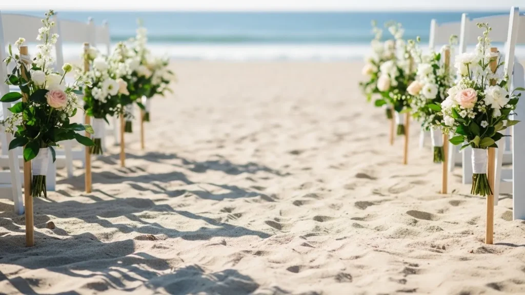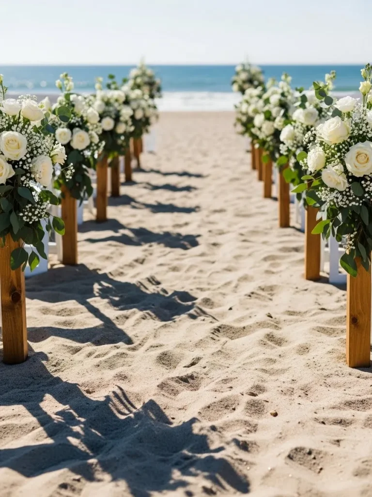Wooden posts line a sandy aisle, each topped with white floral arrangements and greenery. The ocean backdrop keeps the look light and airy while the florals add just the right amount of elegance.