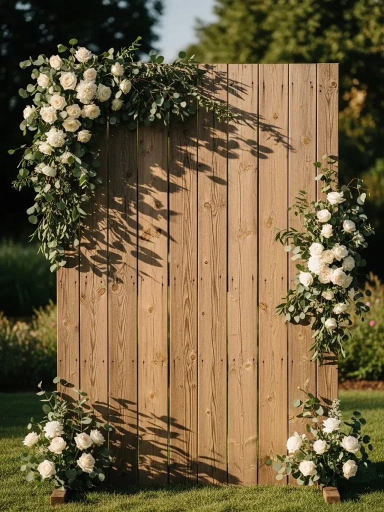 A tall wooden panel stands as the ceremony focal point, dressed with cascading white flowers and lush greenery along the edges. The warm wood texture pairs beautifully with the soft florals and blends naturally into the outdoor setting.