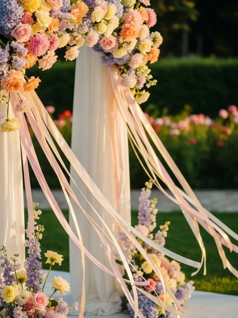Soft pastel florals sit at the top of the arch while long flowing ribbons fall gently toward the ground. The fabric moves beautifully in the breeze and adds a playful softness to the structured arch design.