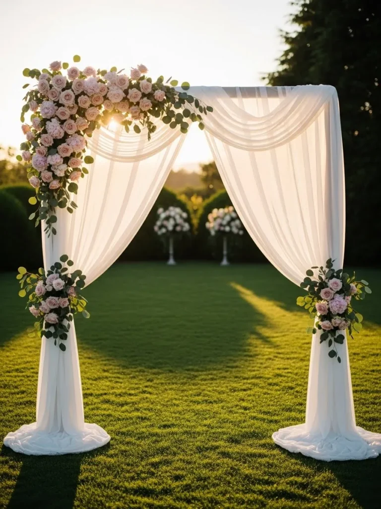 An elegant white arch is wrapped in sheer fabric and finished with floral clusters at the top corners. The draping falls naturally and frames the open lawn behind it for a clean and timeless look.