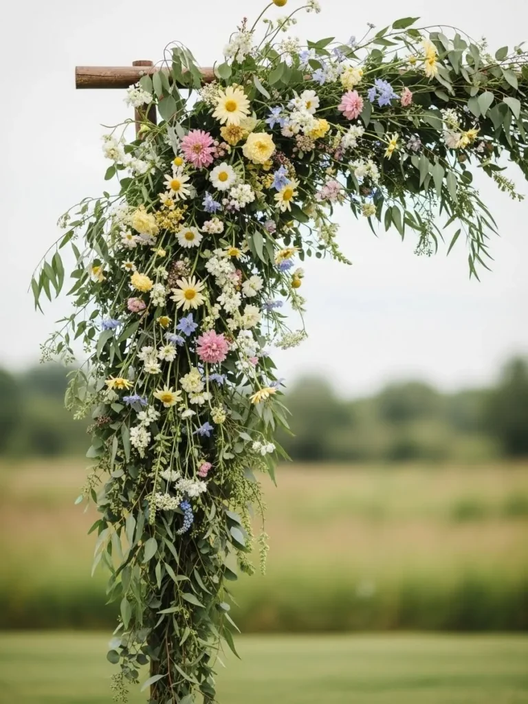 An organic floral arch rises with flowing greenery and pastel blooms arranged in an intentionally uneven design. The loose shape gives it a natural movement that feels light and airy rather than overly styled.