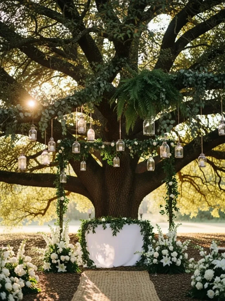 A large tree becomes the natural centerpiece, with hanging lanterns and floral accents framing the ceremony area beneath its branches. White seating and soft arrangements complete the scene and create a cozy gathering space.