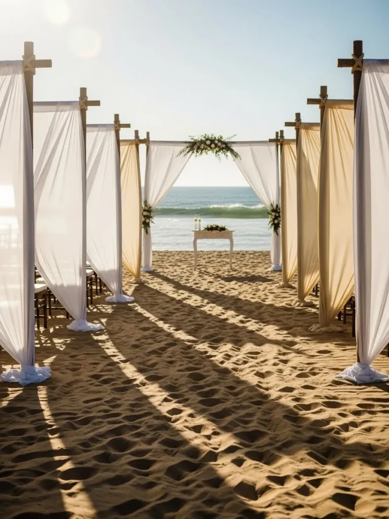 Sheer fabric panels line a sandy aisle that leads toward the ocean, gently moving with the breeze. Wooden posts keep the look simple while allowing the coastal surroundings to shine.