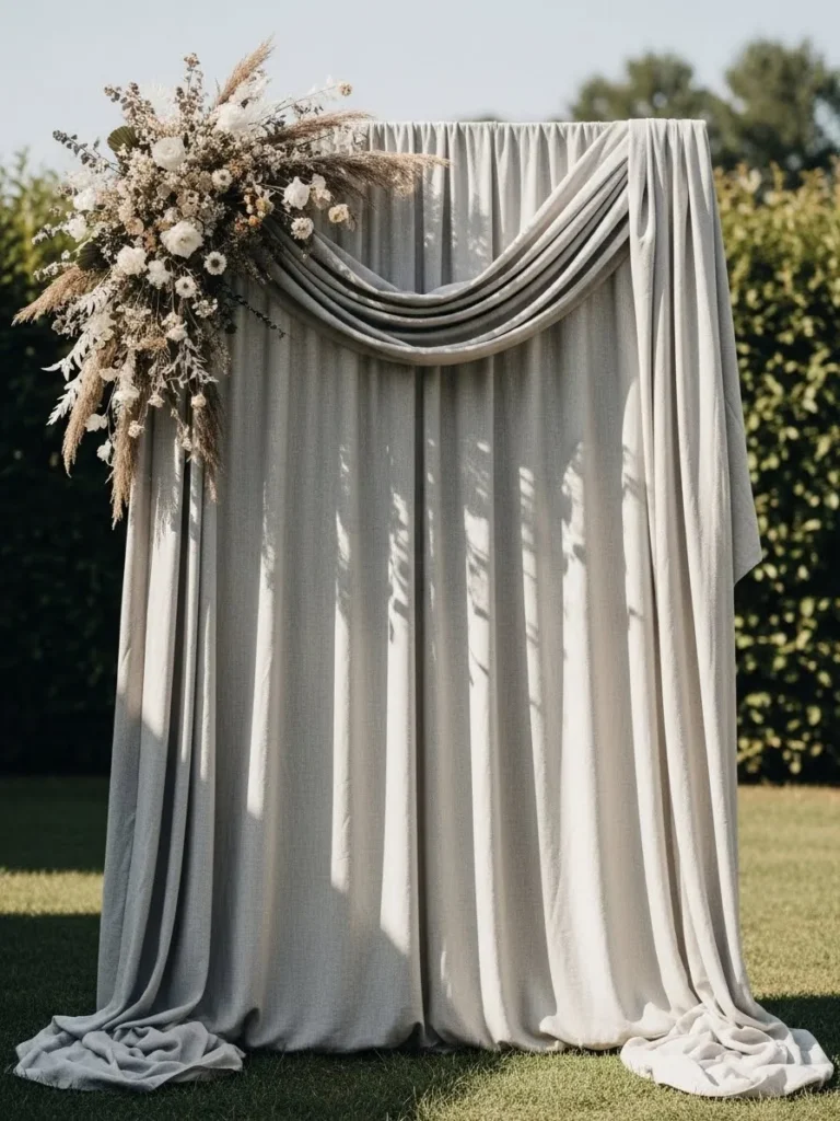Soft neutral fabric is draped into gentle folds with subtle floral accents placed to one side. The light tones and flowing texture create a clean and elegant ceremony focal point.