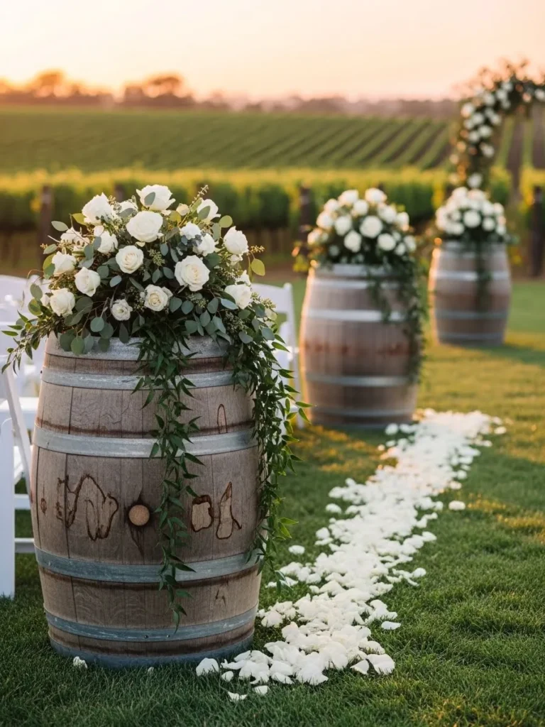 Rustic wooden barrels line the aisle, each topped with lush white floral arrangements and trailing greenery. Flower petals scatter along the grass to softly guide the path forward and add a romantic vineyard touch.