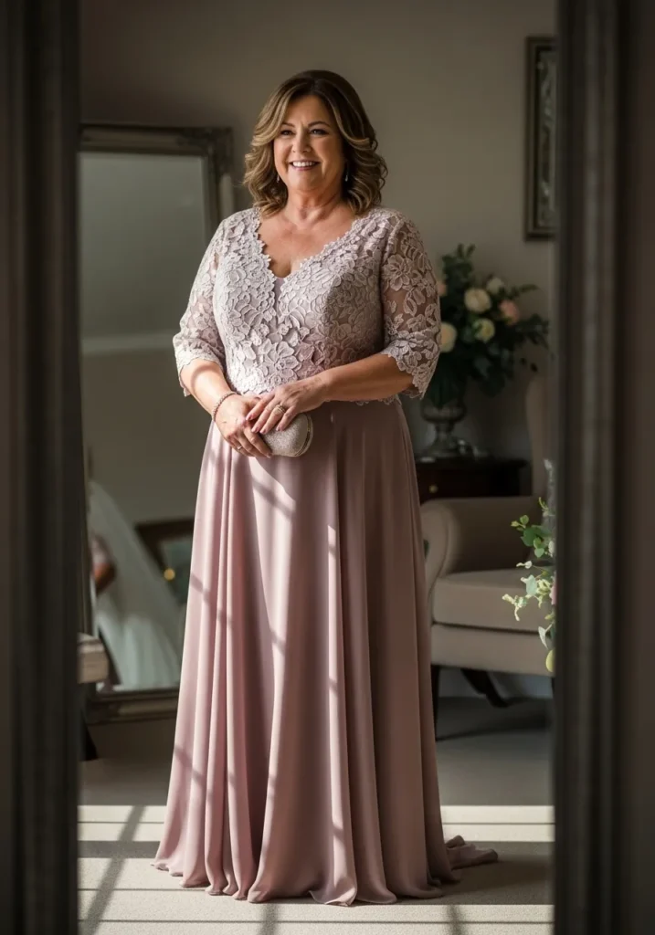 I love how romantic and wearable this dress feels, especially for mothers who want something graceful without feeling overly formal. The soft blush tone feels warm and flattering, and the lace detail brings in that timeless wedding magic that always makes me smile.