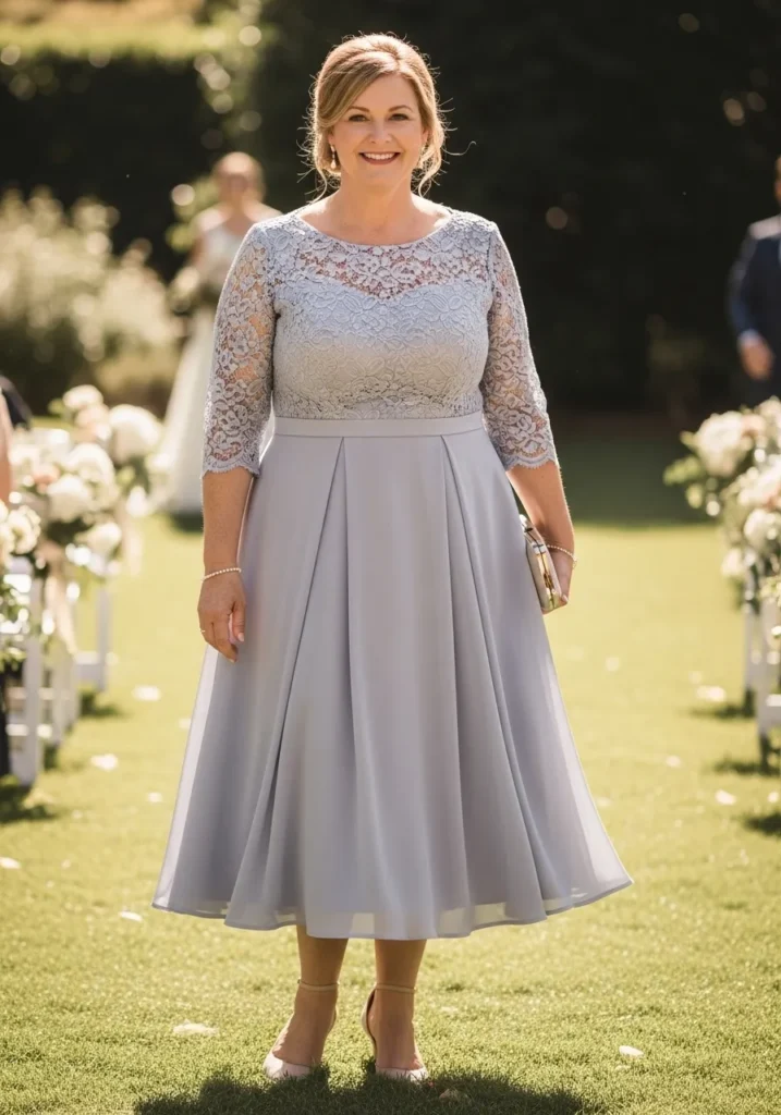 I think this style feels incredibly charming and versatile, especially for daytime weddings. The tea-length cut feels playful yet elegant, making it perfect for mothers who want something unique and comfortable.