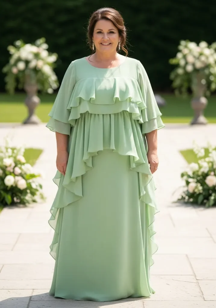 This sage green gown highlights layered chiffon tiers, soft flutter sleeves, and a flowing skirt that creates gentle movement. The muted green tone feels fresh, airy, and beautifully suited for spring celebrations.
