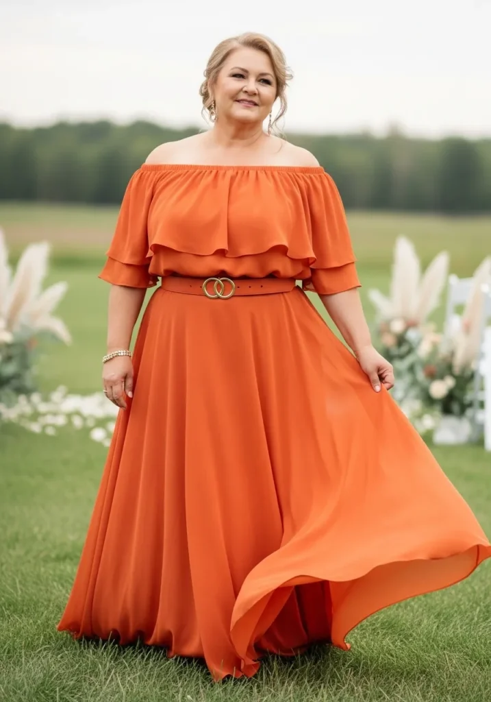 This vibrant tangerine gown showcases a playful off shoulder neckline, flowing chiffon skirt, and a softly cinched waist. The bright hue brings bold energy, while the soft fabric keeps the look romantic.