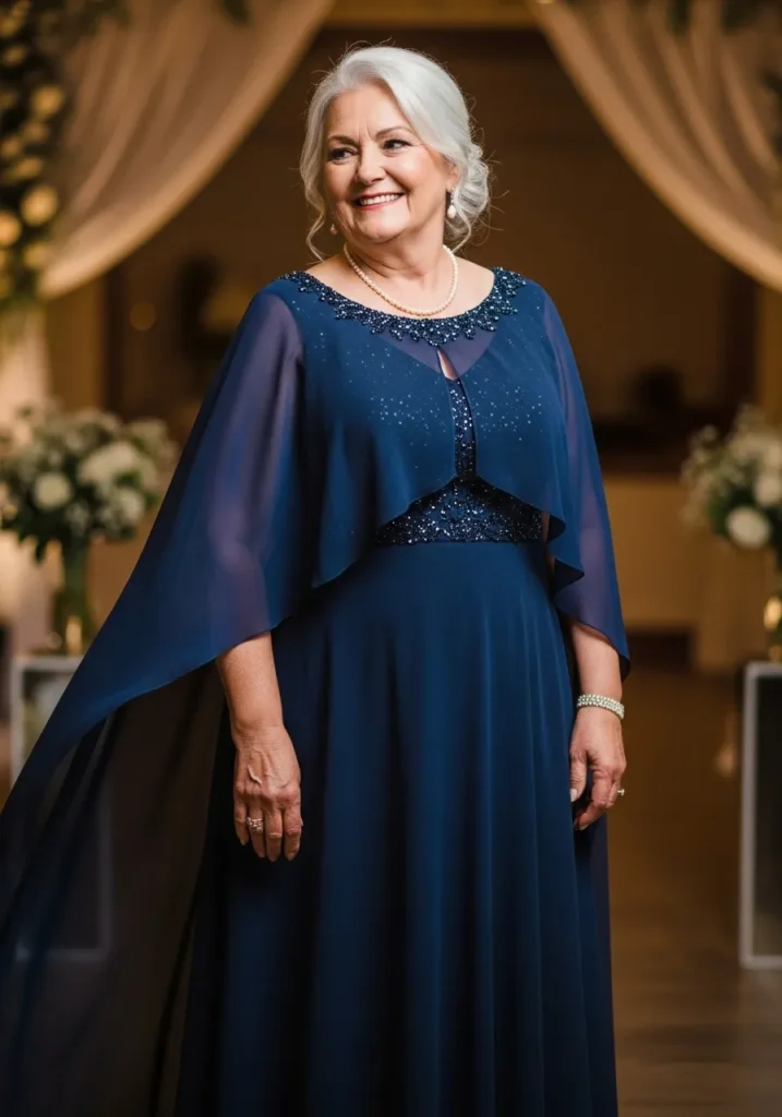I adore how regal and confident this look feels, especially for evening weddings. The cape overlay adds such a dreamy touch, and the deep navy color always feels luxurious and flattering in every season.