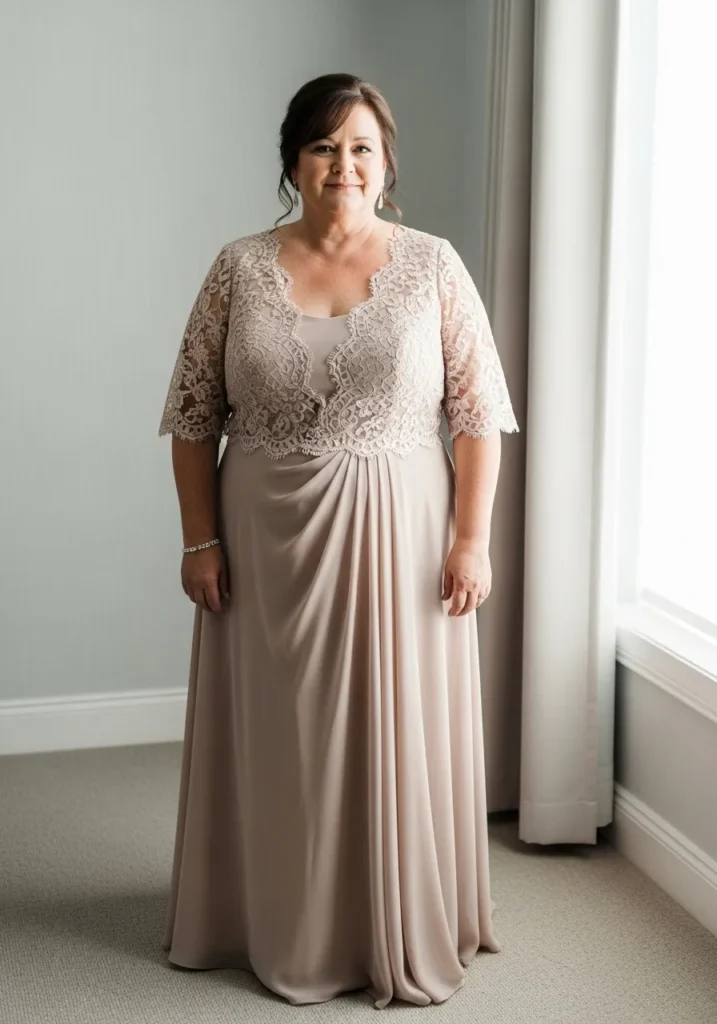 I find this look incredibly flattering and timeless, especially for mothers who prefer understated elegance. The neutral tone feels sophisticated, while the lace detail keeps it feeling special and wedding-ready.