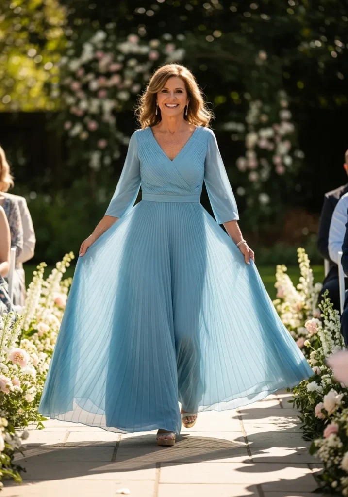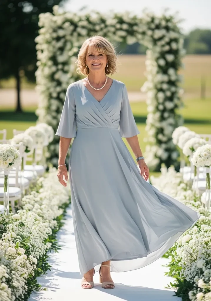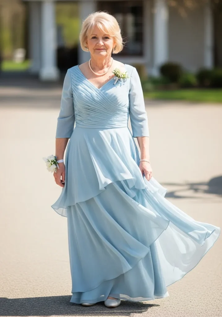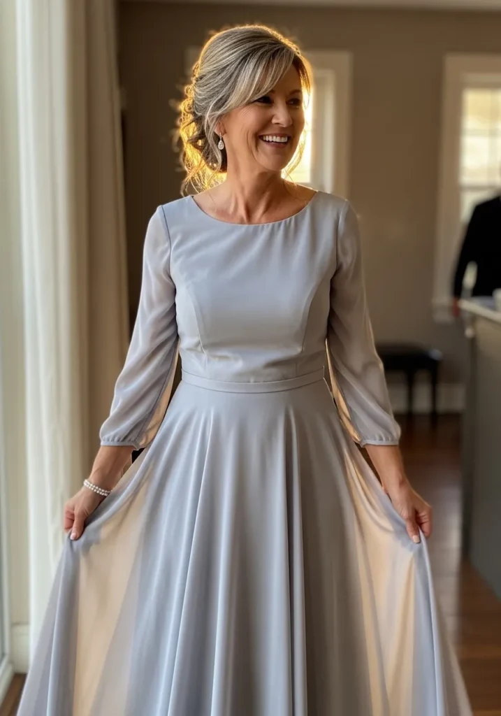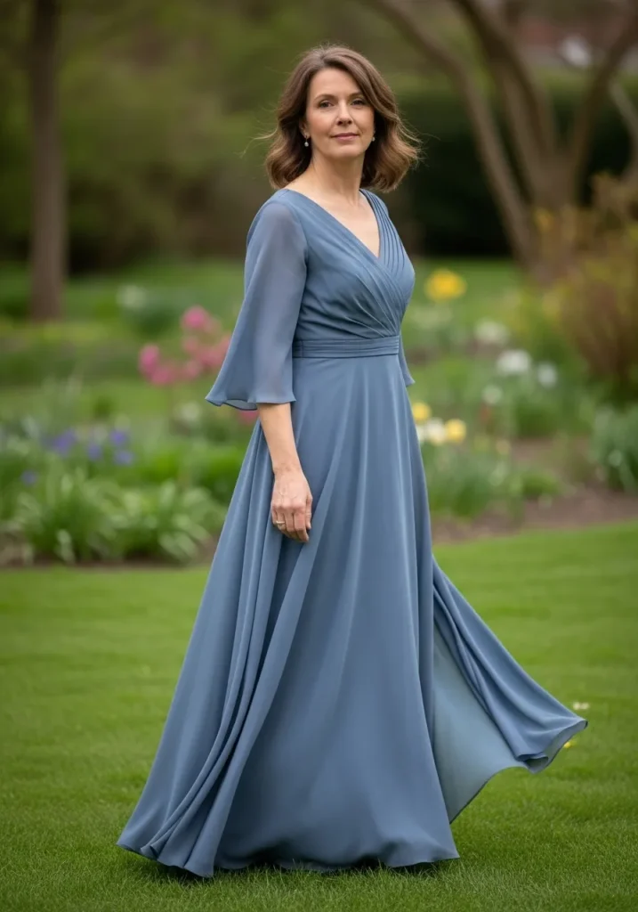 There’s something so soothing about this shade of blue, and I love how the skirt seems to float instead of cling. It feels fresh, flattering, and wonderfully comfortable, which is exactly what I look for in a mother of the bride dress.