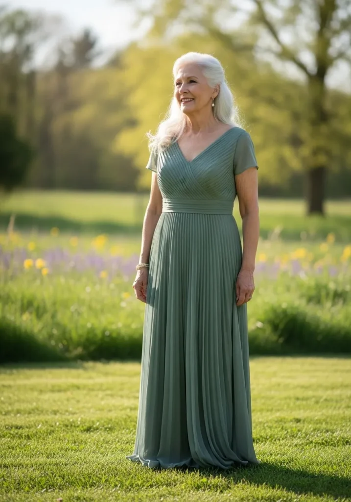 This sage green gown offers a clean neckline, fitted waist, and a flowing skirt that moves gently across the meadow. The soft pleats and airy fabric create subtle motion, giving the dress a peaceful and refined presence.