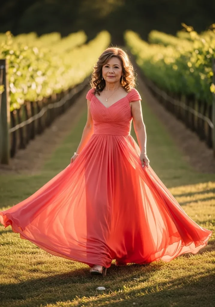 This vibrant coral gown features a fitted bodice and a full flowing skirt that swirls dramatically with motion. The lightweight chiffon fabric lifts and floats effortlessly, creating bold movement and a striking silhouette against a sunlit vineyard backdrop.