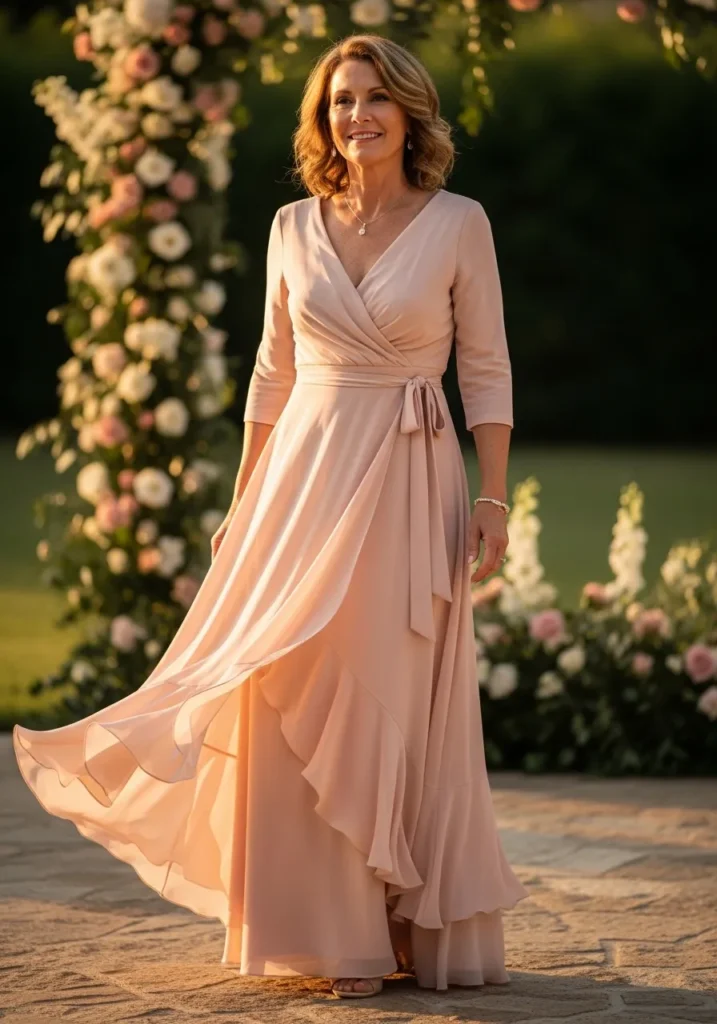 This soft blush wrap-style gown features gentle draping across the bodice and a flowing skirt that cascades naturally with each step. The lightweight fabric and warm pastel tone create a romantic, graceful look that feels light and dreamy in a floral garden setting.