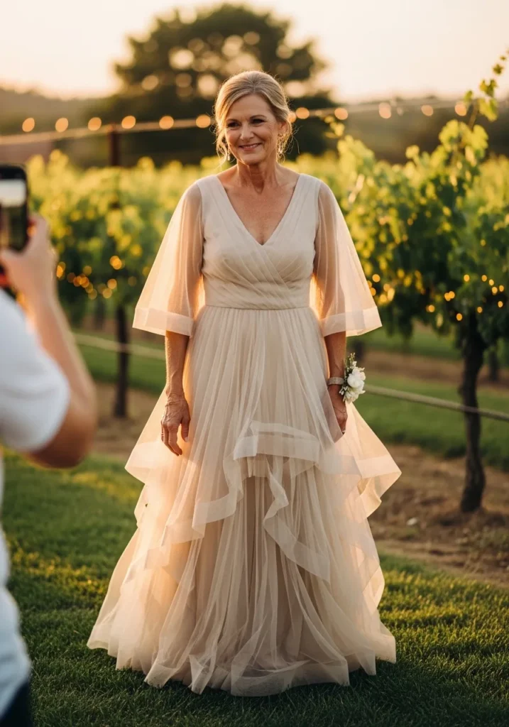 This champagne-toned gown features sheer flutter sleeves, delicate layering, and a flowing skirt that glows softly in the warm vineyard light. The airy tulle layers move gently with each step, creating a romantic and ethereal silhouette perfect for golden hour celebrations.