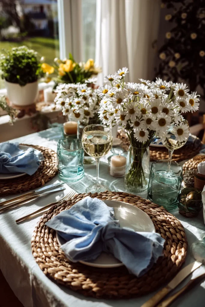 This tablescape showcases cheerful white daisies arranged in clear glass vases, paired with soft blue linens and woven rattan chargers. Light blue napkins are casually knotted on crisp white plates while clear and aqua toned glassware catches the sunlight. Small candles are tucked between the florals, and the whole table sits near a bright window that floods the setup with warm natural light.