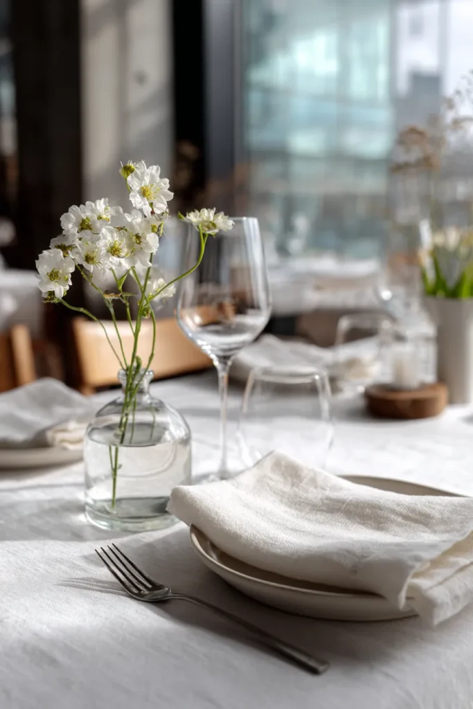 This tablescape keeps things soft and simple with crisp white linens, neutral ceramic plates, and gently folded fabric napkins. Petite white blossoms are arranged in small clear glass bottles, paired with classic wine glasses and subtle candle accents. Natural light pours across the table, highlighting the clean textures and calm color palette that feels airy and refined.