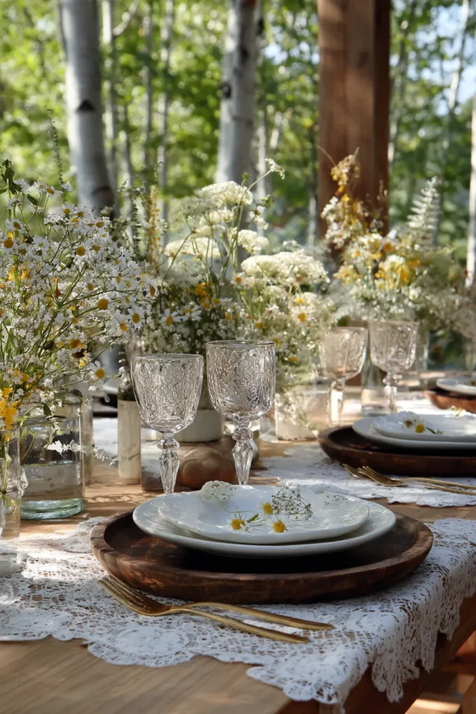This tablescape is styled with layers of natural textures and soft spring florals set against a forest backdrop. A delicate lace runner stretches across the wooden table while white ceramic plates rest on warm wood chargers. Clear etched goblets add a vintage touch, and loose arrangements of chamomile style blooms and airy wildflowers spill from simple glass vases. Sunlight filters through the trees and catches on the glassware, giving the whole setting a gentle woodland glow.