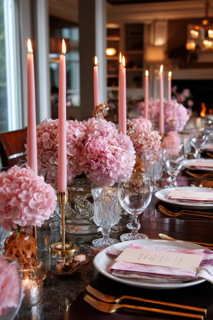 This tablescape features lush pink hydrangea arrangements running down a glossy dark table, paired with tall blush taper candles glowing in elegant gold holders. Crystal glassware adds sparkle alongside layered white plates, soft pink stationery, and neatly folded napkins. Warm candlelight reflects off the glass and polished surface, creating a cozy romantic atmosphere that feels intimate and elevated.