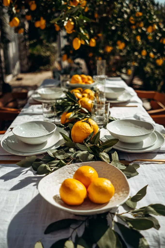 This tablescape is styled with crisp white linens, simple ceramic plates, and clear glassware set beneath lush lemon trees. Fresh lemons and leafy branches run down the center of the table, creating a natural runner that feels vibrant and organic. Soft sunlight filters through the citrus canopy, casting warm shadows across the table and giving the entire setup a relaxed outdoor glow.