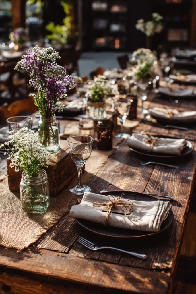 This tablescape features a long weathered wooden table styled with burlap runners, linen napkins tied with twine, and simple dark plates. Small jars of wildflowers in soft purples and whites are scattered down the center alongside wood blocks, amber glass, and classic stemware. The setting feels cozy and grounded with warm sunlight highlighting the textures and giving everything that relaxed countryside glow.