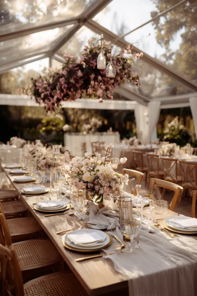 This tablescape is set inside a light filled greenhouse with long wooden tables dressed in soft neutral runners and layered white plates. Delicate blush and cream florals sit in full arrangements along the center, while crystal glassware and gold flatware add a gentle glow. Overhead, hanging floral installations and small pendant lights create a dreamy canopy that ties the whole space together in the prettiest way.