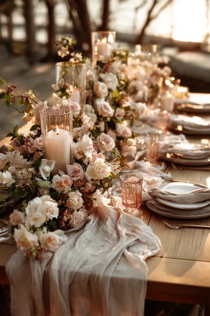 This tablescape features a flowing arrangement of blush and ivory roses woven down a warm wooden table, paired with tall glass candle holders glowing softly as the light fades. Sheer neutral linens drape effortlessly between place settings while layered plates and blush tinted glassware add subtle warmth. The florals feel lush and organic, spilling naturally around the candles and creating a romantic garden inspired runner.
