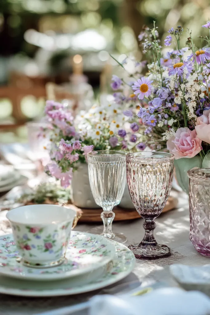 This tablescape feels like a charming spring afternoon with delicate floral china, soft pastel glassware, and loosely arranged garden blooms. Lavender daisies, blush roses, and tiny white flowers fill low ceramic vessels while patterned teacups sit atop matching plates. Faceted goblets in clear and soft mauve catch the light, and the whole table is layered over a neutral linen that lets every detail shine without feeling busy.