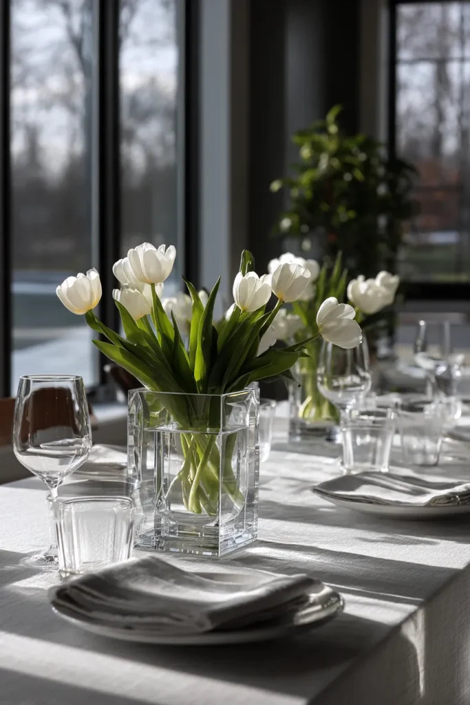 This tablescape features crisp white tulips arranged in clean square glass vases, set atop smooth white linens and minimalist place settings. Clear stemware and simple plates keep the look refined, while soft daylight streams through large windows and highlights the fresh green stems and delicate petals. The overall setup feels bright and intentional with every detail kept calm and uncluttered.
