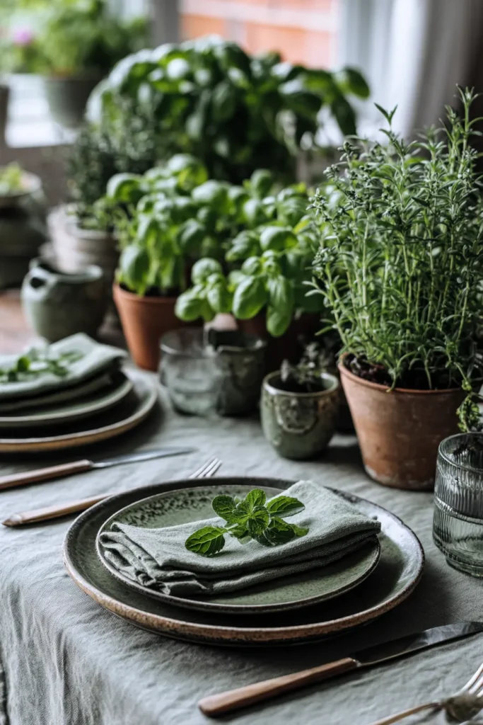 This tablescape features layered stoneware plates in earthy tones, soft linen napkins, and a simple sprig of fresh herbs placed on each setting. Potted rosemary, basil, and mint line the table in natural clay pots, creating a lush green centerpiece that feels organic and relaxed. The muted linens and rustic tableware let the greenery shine while filtered daylight gives everything a calm indoor garden feel.