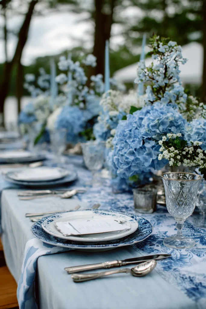 This tablescape is layered in soft blue tones with full hydrangea arrangements mixed with delicate white blossoms running down the table. Patterned blue and white plates sit atop pale linens while clear crystal goblets and vintage style flatware add a classic touch. The floral runner and textured tablecloth bring depth and movement, and the outdoor setting framed by trees gives everything a breezy garden feel.