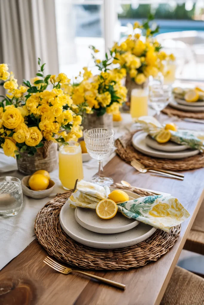 This tablescape is bursting with sunshine thanks to bright yellow floral arrangements, fresh lemons, and warm natural textures. Woven chargers sit beneath neutral plates while patterned napkins with citrus motifs are casually draped on top. Clear crystal glassware, soft white linens, and small bowls of lemons line the table, creating a fresh and inviting look that feels perfect for a spring daytime celebration.