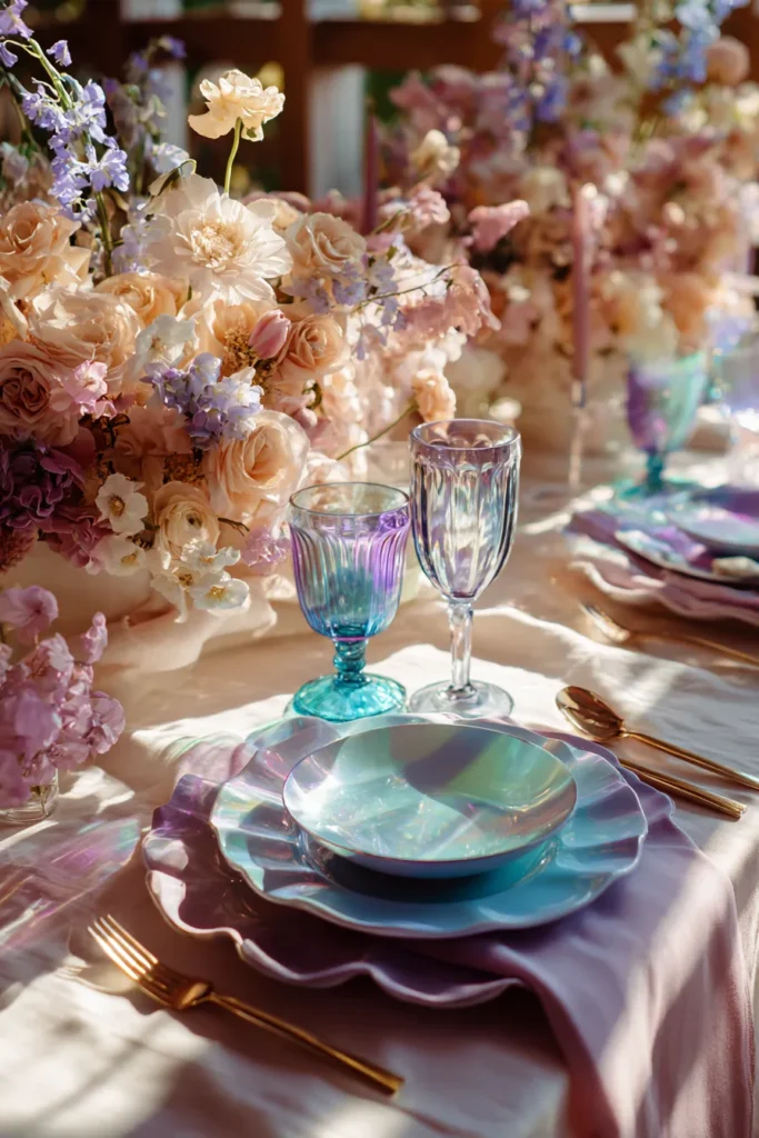 This tablescape glows with soft pastel florals in blush peach and lavender tones arranged in lush garden style centerpieces. Iridescent plates catch the light with subtle rainbow hues while pastel glassware in blue and lilac adds a dreamy shimmer. Gold flatware rests on flowing pink linens and delicate taper candles rise between the flowers to complete the romantic layered look.