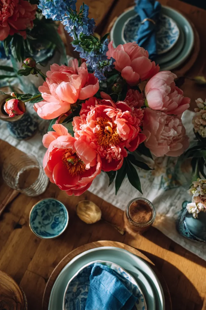 This tablescape centers around lush coral peonies and soft blue florals arranged in relaxed ceramic vessels on a warm wooden table. Layered plates in muted tones are paired with patterned napkins and simple glassware, while small ceramic bowls and natural textures add an artisan feel. The overhead view highlights the rich colors and thoughtful details that make the table feel curated but never stiff.