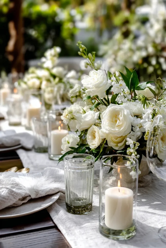 This tablescape is styled with lush white roses and delicate spring blooms arranged in low natural centerpieces that run along a crisp linen runner. Clear glass cylinders hold softly glowing candles while simple glassware and neutral plates keep the look light and airy. The greenery peeking through the florals adds freshness and depth, and the outdoor garden setting gives everything a calm sunlit glow.