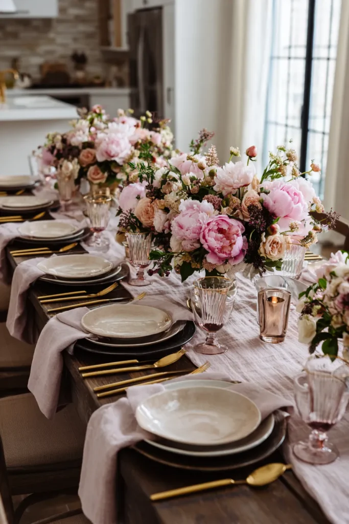 This tablescape features full blush peonies and soft neutral blooms arranged in lush centerpieces that run the length of a dark wooden table. Gentle linen runners flow between layered ceramic plates while ribbed glassware and gold toned flatware add a warm polished touch. Small candle holders glow softly among the flowers, and natural daylight from nearby windows gives the whole setup an inviting spring atmosphere.