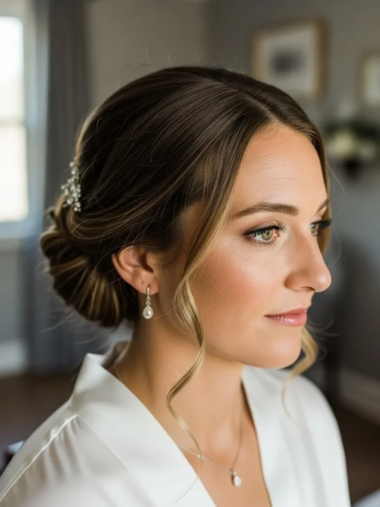 This bridal look features softly swept hair styled into a low romantic updo with loose face framing pieces, paired with natural glowing makeup that uses warm blush, gentle contour, and soft neutral eyes for a polished but effortless finish, while pearl drop earrings and a simple neckline keep everything light and refined.
