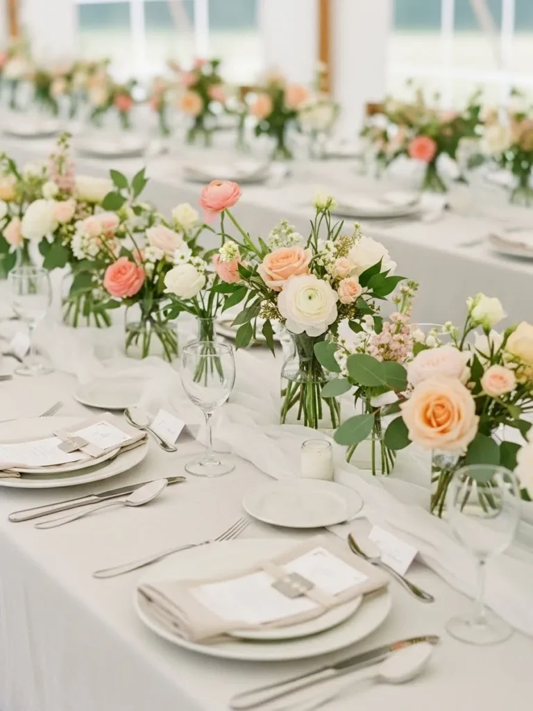 The table is styled with crisp white linens, soft floral centerpieces, and classic place settings that feel clean and refined, with neutral tones paired alongside delicate blooms for a look that feels timeless and fresh.